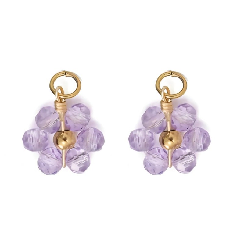 Colgante margarita cinco pétalos de bolitas lila con anilla abierta en acero inoxidable dorado.