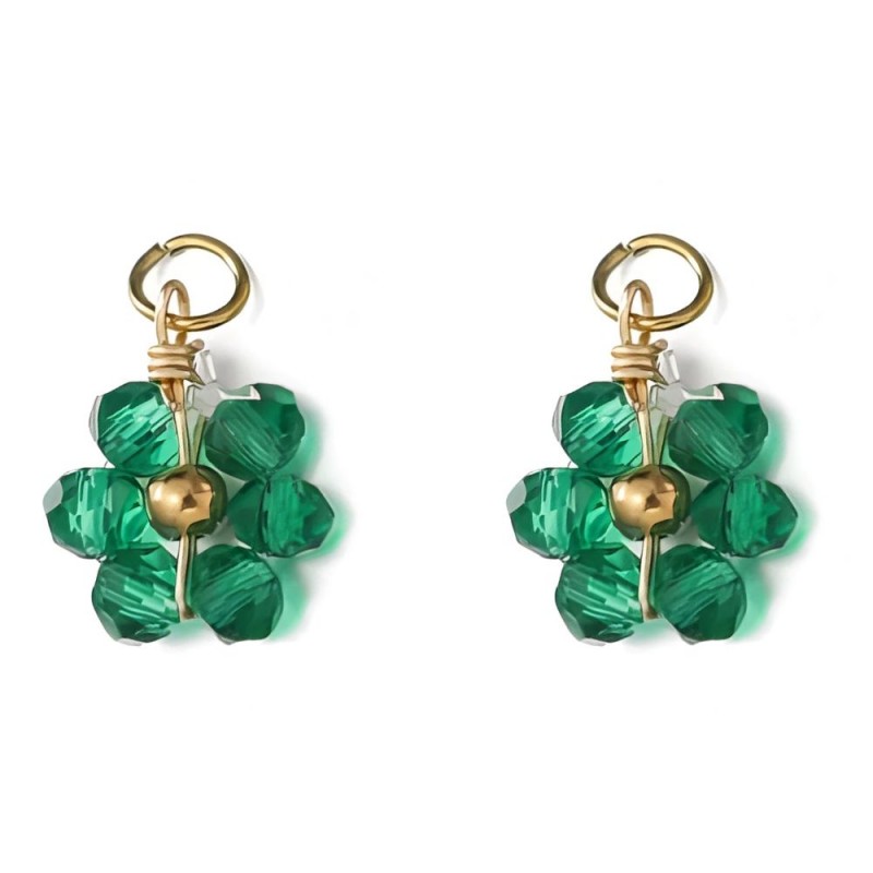 Colgante margarita cinco pétalos de bolitas verdes con anilla abierta en acero inoxidable dorado.