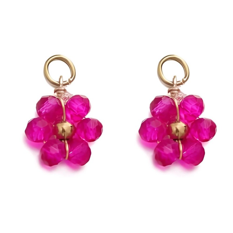 Colgante margarita cinco pétalos de bolitas fucsia con anilla abierta en acero inoxidable dorado.