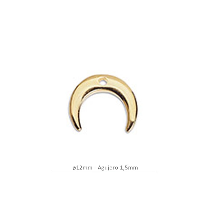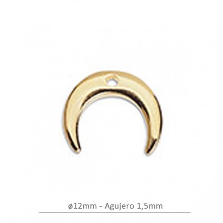 Colgante mini luna. Zamak con baño de oro. La bolsa contiene 2 unidades. Tiene un tamaño de 12 mm. y tiene un taladro de 1,5 mm.