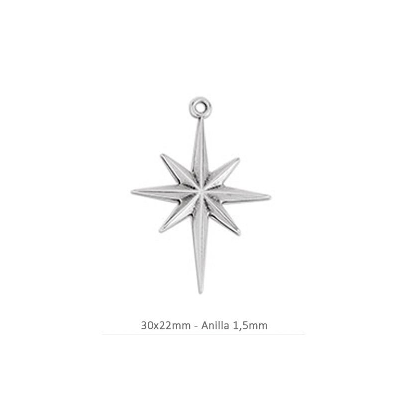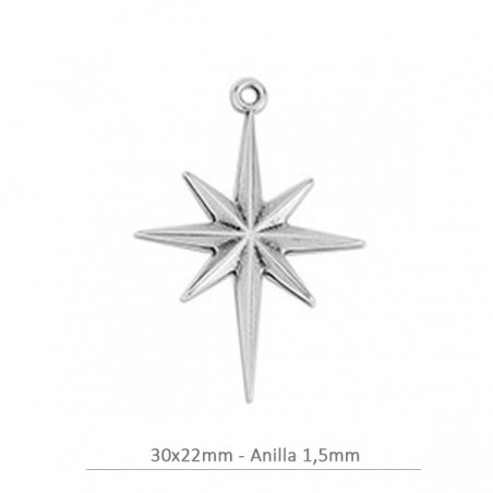 Colgante estrella polar de zamak bañado en plata. De 30x22 mm, anilla 1,5mm El precio es por unidad.