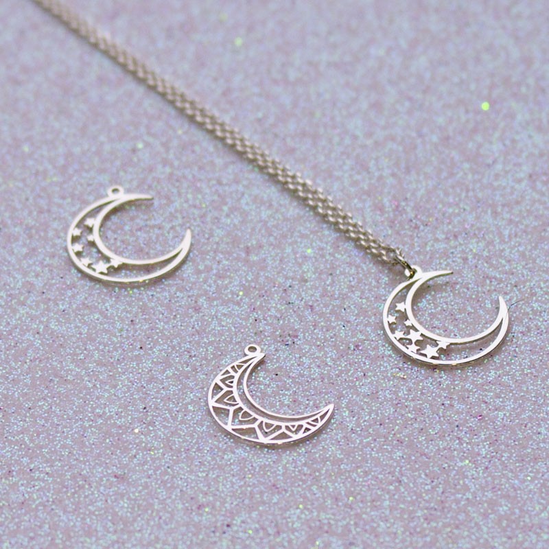 Colgante luna con estrellas y asa en plata de ley 925. Fabricado en España.