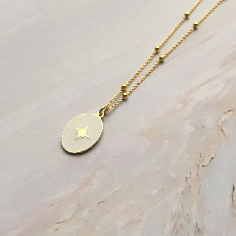 Colgante ovalado con estrella polar y esmalte blanco en plata de ley 925, bañado en oro de 18k. Fabricado en España.