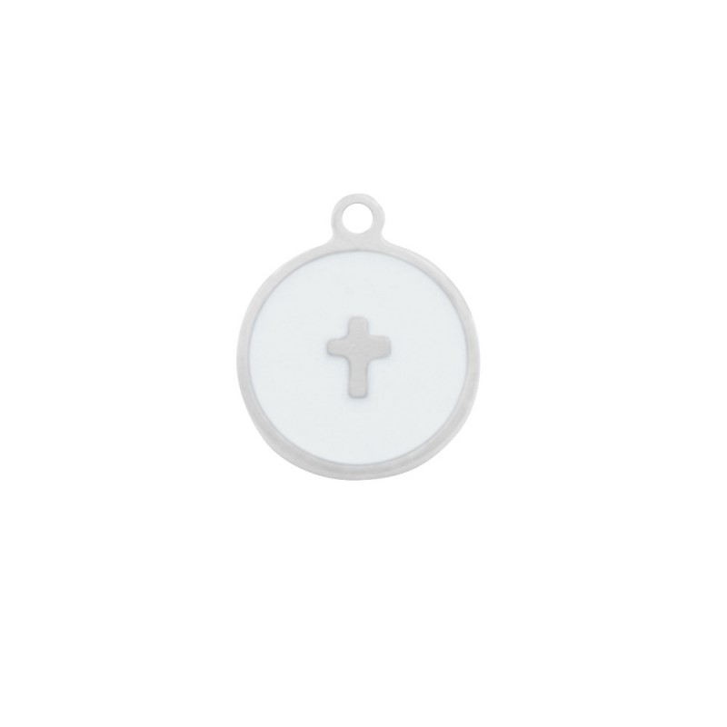 Colgante cruz redondo en plata de ley 925, esmaltado en blanco. Fabricada en España.