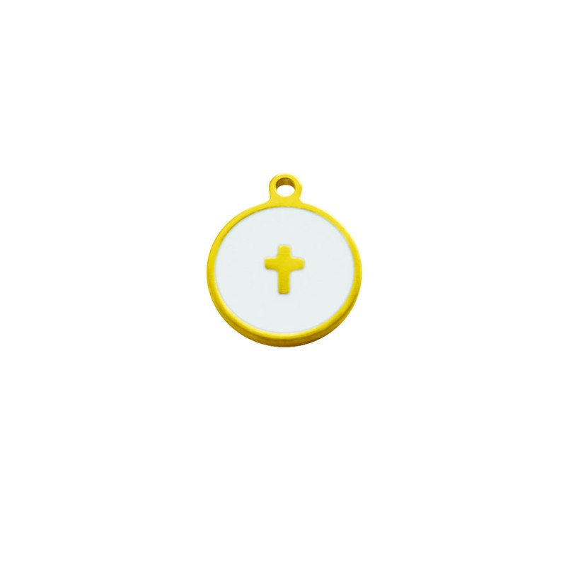 Colgante cruz redondo en plata de ley 925, bañada en oro de 18k y esmaltado en blanco. Fabricada en España.