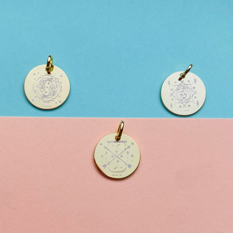 Colgante horóscopo Géminis redondo en plata de ley 925, bañada en oro de 18k y grabado en blanco con el símbolo de Géminis. Fabricado en España.