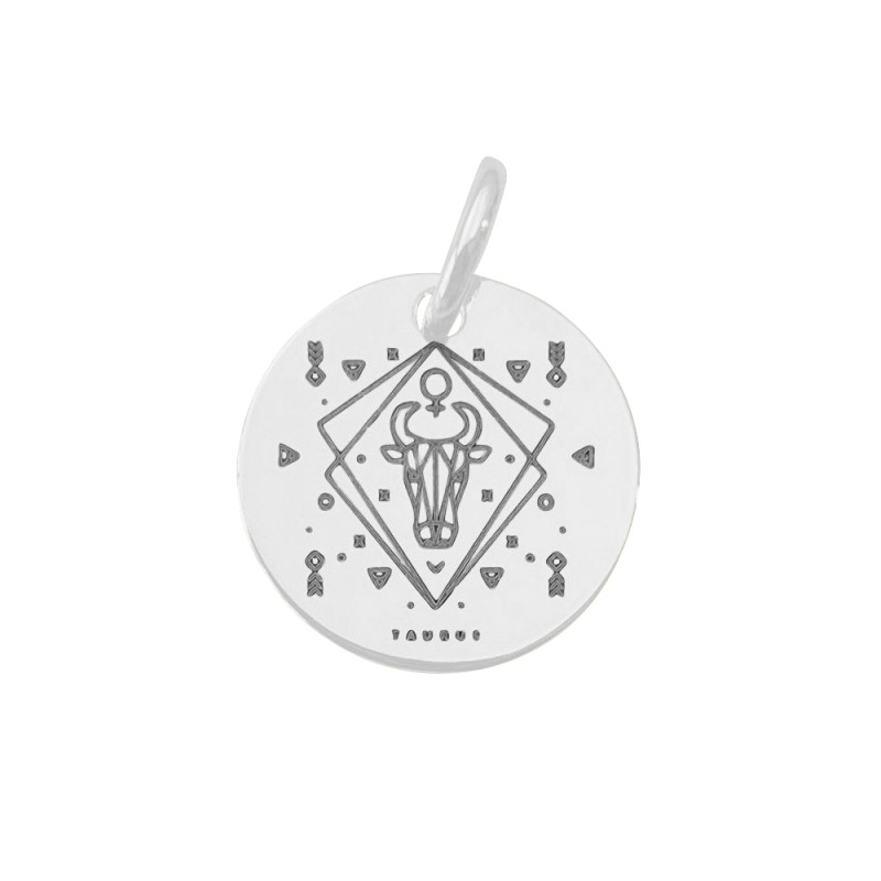 Colgante horóscopo Tauro redondo en plata de ley 925 y grabado en blanco con el símbolo de Tauro. Fabricado en España.