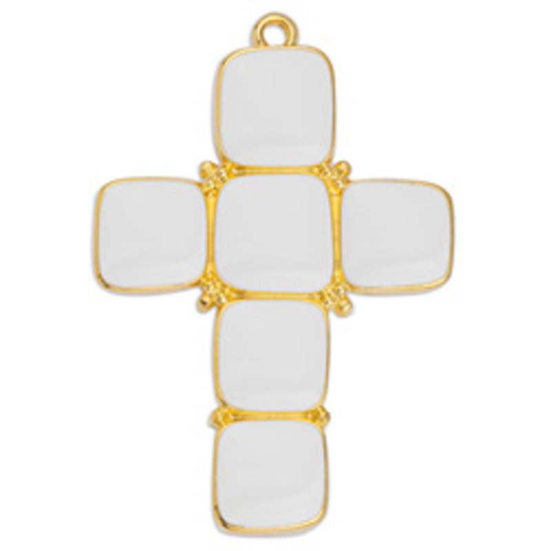 Colgante cruz de zamak en baño de oro de 24k con esmalte blanco.