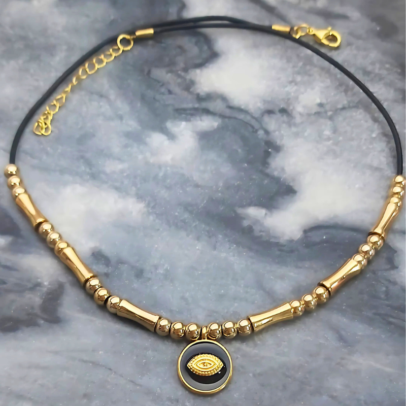 Colgante ojo esmalte negro. Zamak con baño de oro 24k.