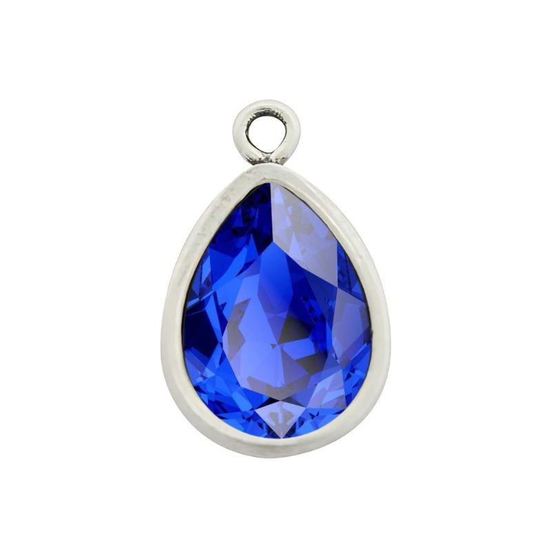 Colgante con asa en zamak con baño de plata con cristal lágrima Swarovski en color Sapphire 14x10 mm. Le recomendamos pegar ambas piezas con nuestro pegamento especial para joyería con referencia 7405, ya que no vienen pegadas.