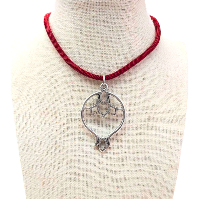 Colgante en forma de granada y contorno superior en forma de flor de loto en zamak con baño de plata.
