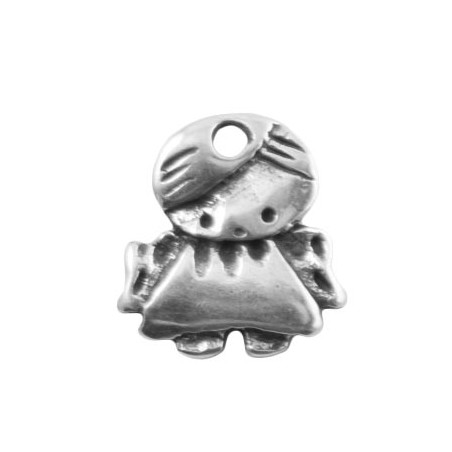 Colgante angelito en zamak con baño de plata. La bolsa contiene 1 unidad. El tamaño es de 28x28 mm. y el taladro es de 3 mm.