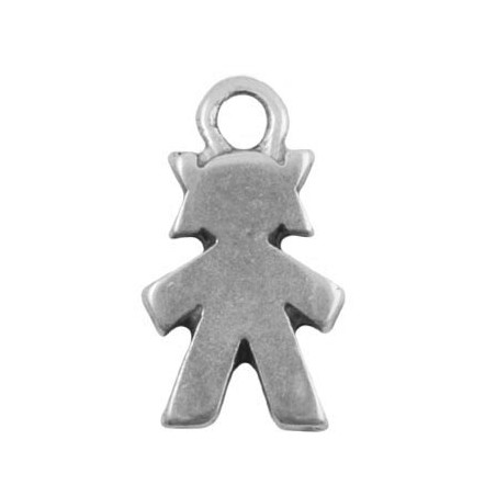 Colgante niña con taladro transversal en zamak con baño de plata. La bolsa contiene 1 unidad. El tamaño es de 21x12 mm. y la anilla es de 3 mm.