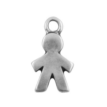 Colgante niño con taladro transversal en zamak con baño de plata. La bolsa contiene 1 unidad. El tamaño es de 21x12 mm. y la anilla es de 3 mm.