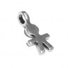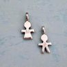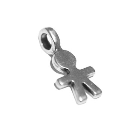 Colgante niño en zamak con baño de plata. La bolsa contiene 4 unidades. Tiene un tamaño de 15x7,5 mm. y tiene un taladro de 3 mm.