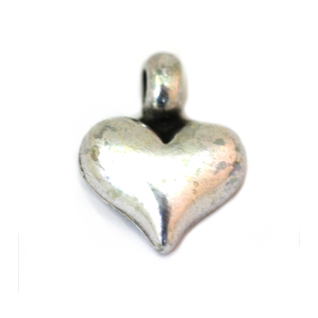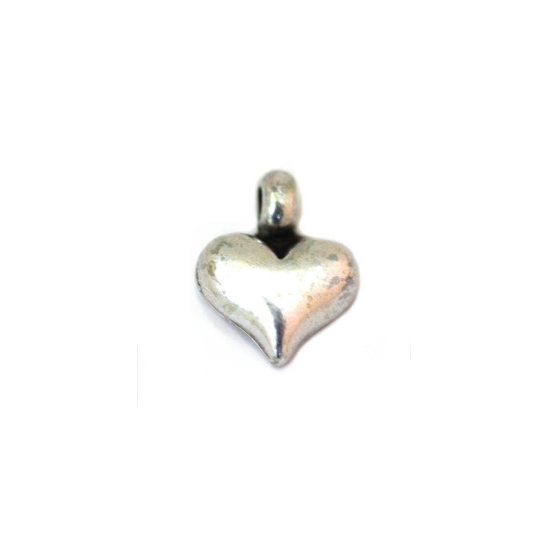 Colgante corazón en zamak con baño de plata. La bolsa contiene 1 unidad. El tamaño es de 18 x 14.5 mm. y el taladro es de 3.5 mm.