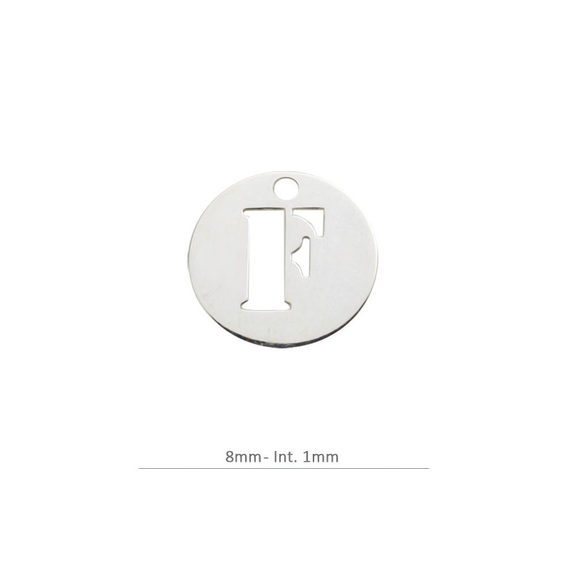 Colgante Charm redondo letra F. 8 mm con taladro 1.2 mm