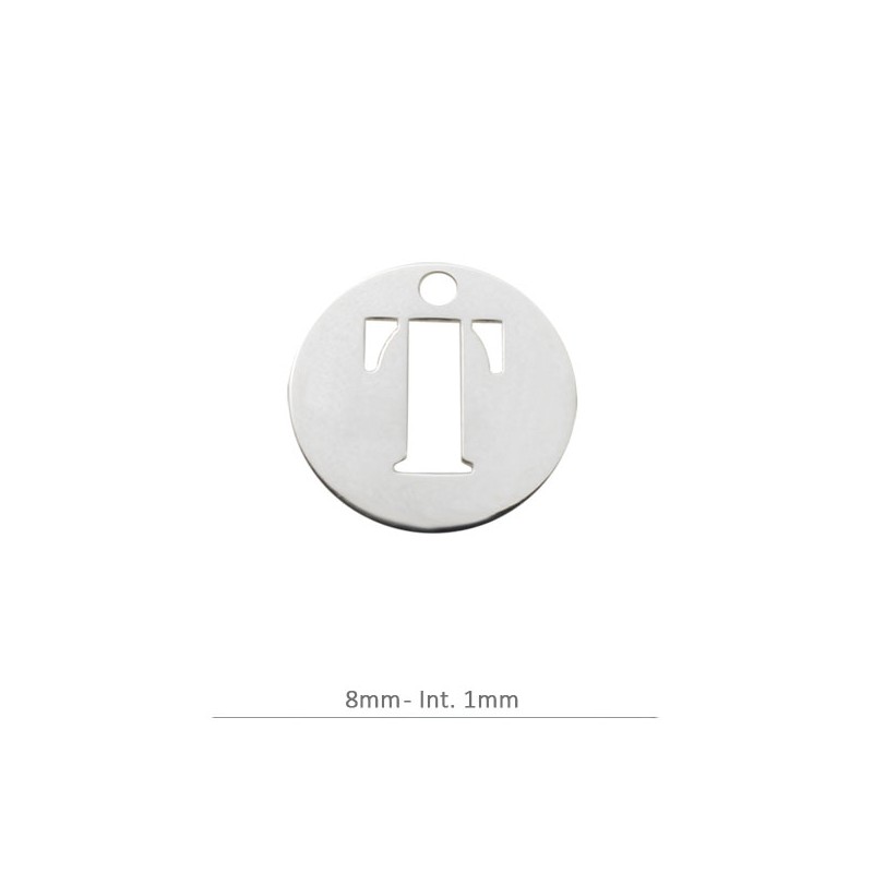 Colgante Charm redondo letra T. 8 mm con taladro 1.2 mm