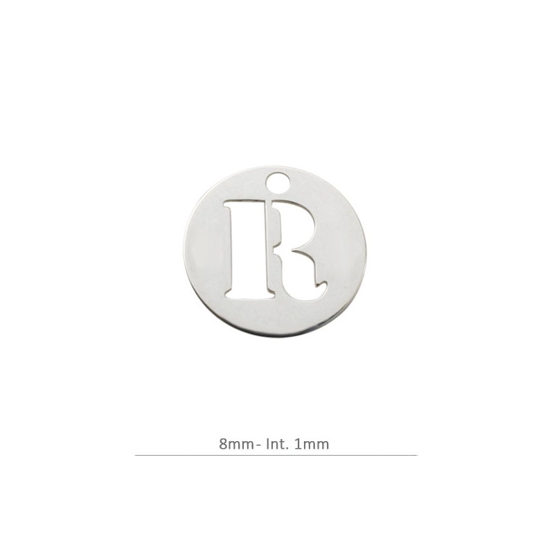 Colgante Charm redondo letra R. 8 mm con taladro 1.2 mm