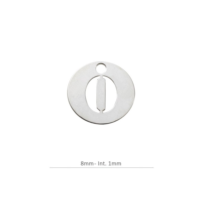 Colgante charm redondo número 0 en plata de ley 925. Fabricado en España.