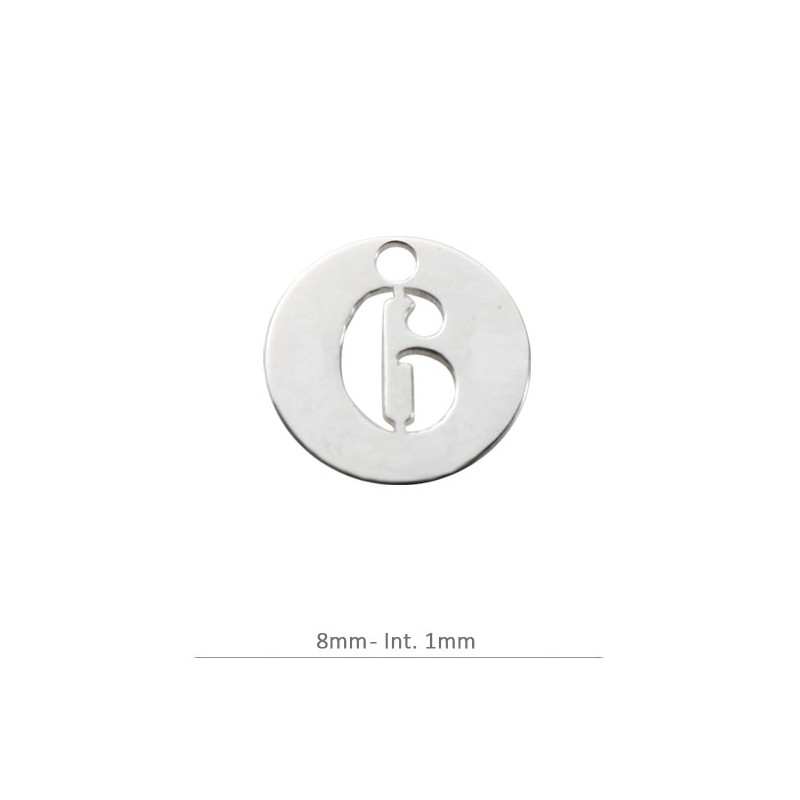Colgante charm redondo número 6 en plata de ley 925. Fabricado en España.