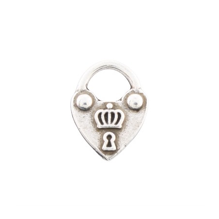 - Colgante candado con forma de corazón en zamak con baño de plata. - El tamaño es de 20x14mm. - La bolsa contiene 1 unidad.