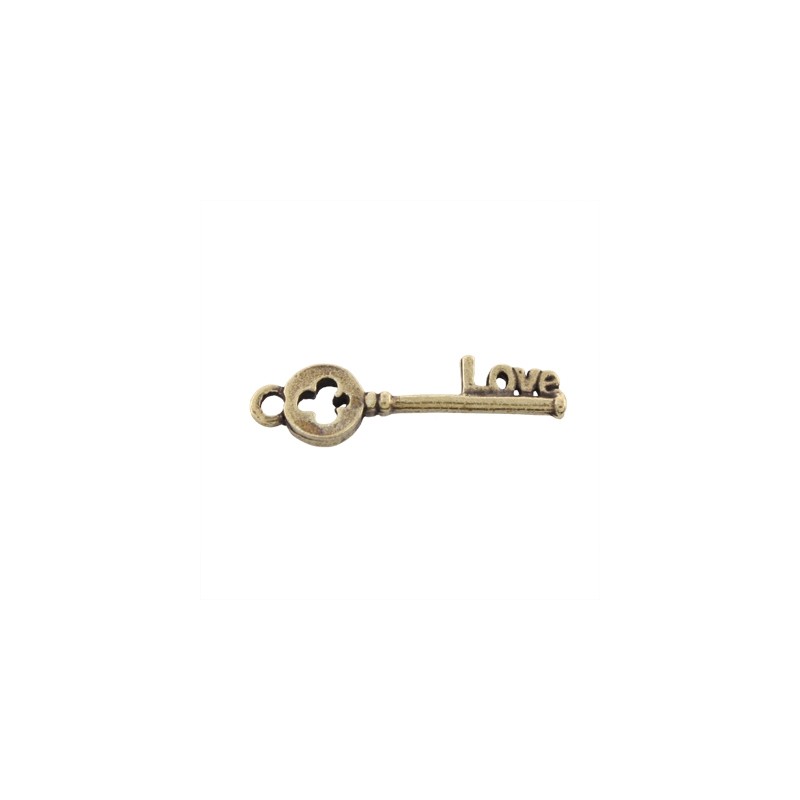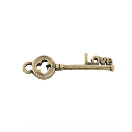 - Colgante llave en zamak con baño en color oro viejo. - El tamaño es de 30x8mm. - El precio es por bolsa y la bolsa incluye dos unidades.