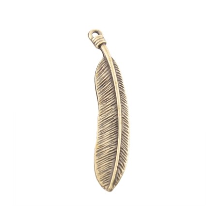 - Colgante pluma en zamak con baño en color oro viejo. - Tamaño: 44x9mm - El precio es por bolsa y la bolsa incluye 2 unidades.