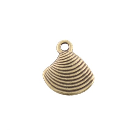 - Colgante concha en zamak con baño de color oro viejo. - El tamaño es de 14x12mm. - El precio es por bolsa y la bolsa incluye cuatro unidades.