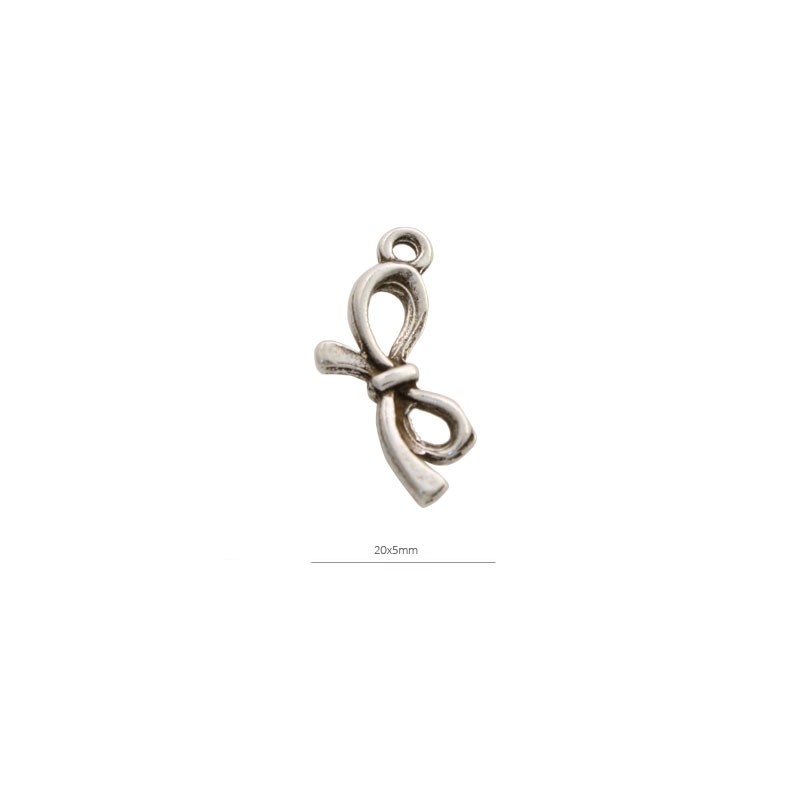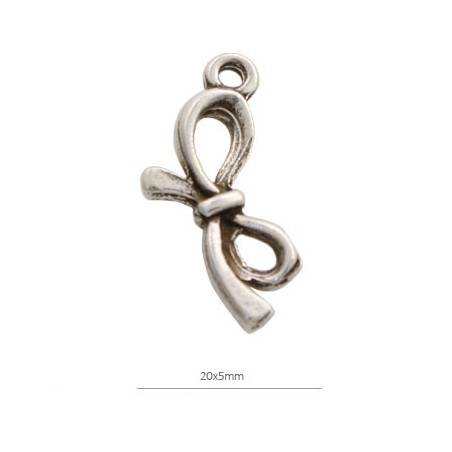 - Colgante lacito de zamak con baño de plata. - Tiene un tamaño de 20x5 milímetro. - El precio es por bolsa y la bolsa contiene dos unidades.