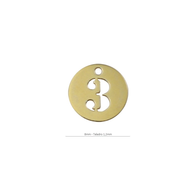 Colgante charm redondo número 3 en plata de ley 925 con baño de oro 18k. Fabricado en España.