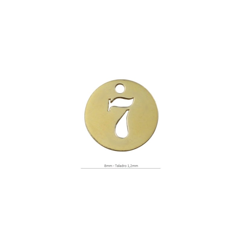 Colgante charm redondo número 7 en plata de ley 925 con baño de oro 18k. Fabricado en España.