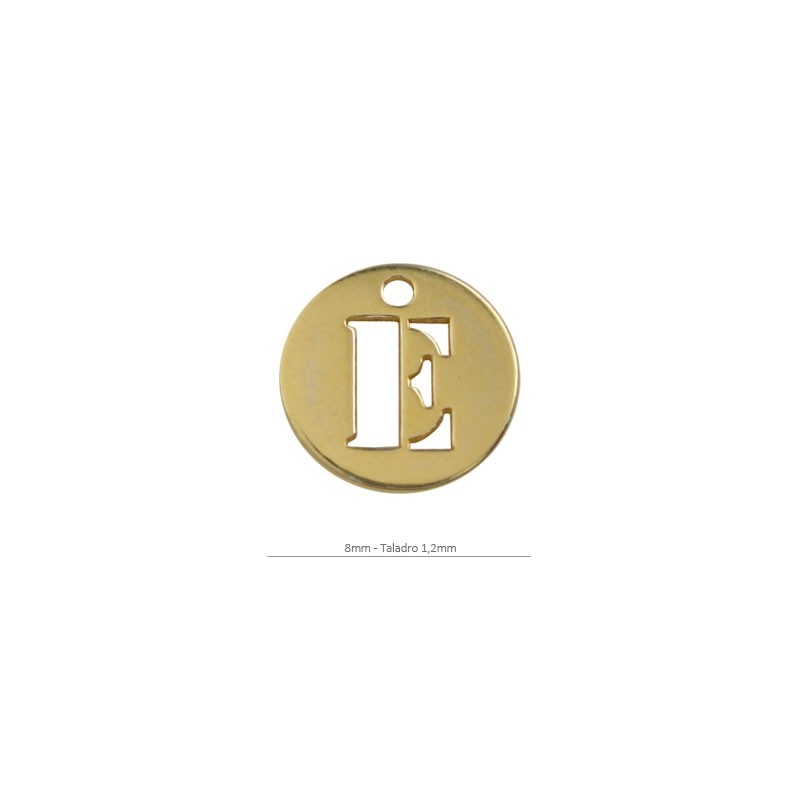 Colgante charm redondo letra E en plata de ley 925 con baño de oro 18k. Fabricado en España.