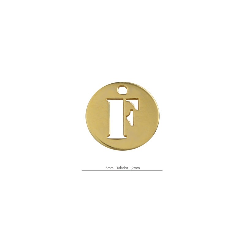 Colgante charm redondo letra F en plata de ley 925 con baño de oro 18k. Fabricado en España.