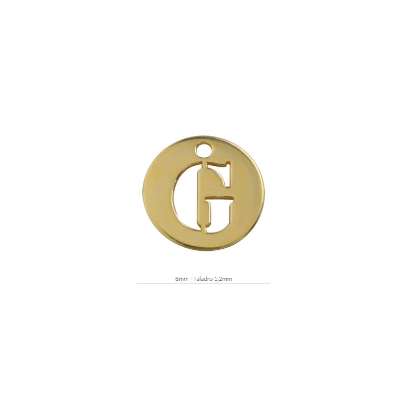 Colgante charm redondo letra G en plata de ley 925 con baño de oro 18k. Fabricado en España.