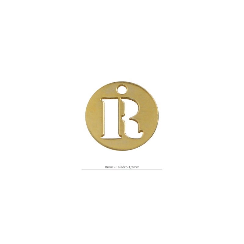 Colgante charm redondo letra R en plata de ley 925 con baño de oro 18k. Fabricado en España.