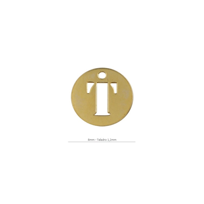 Colgante charm redondo letra T en plata de ley 925 con baño de oro 18k. Fabricado en España.