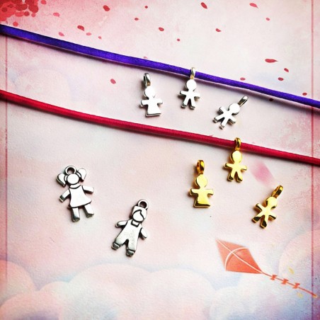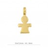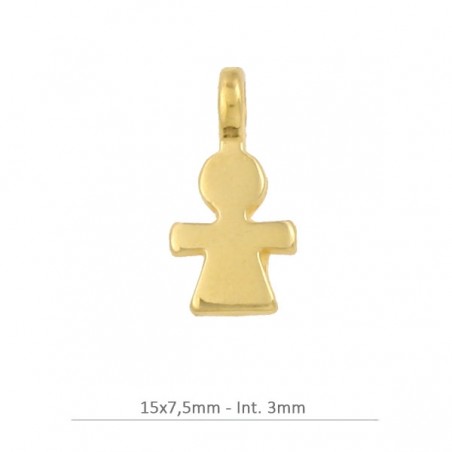 - Colgante niña en zamak con baño de oro. - El tamaño es de 15x7,5 milímetros y el taladro es de 3 milímetros. - El precio es por bolsa y la bolsa incluye 4 unidades.