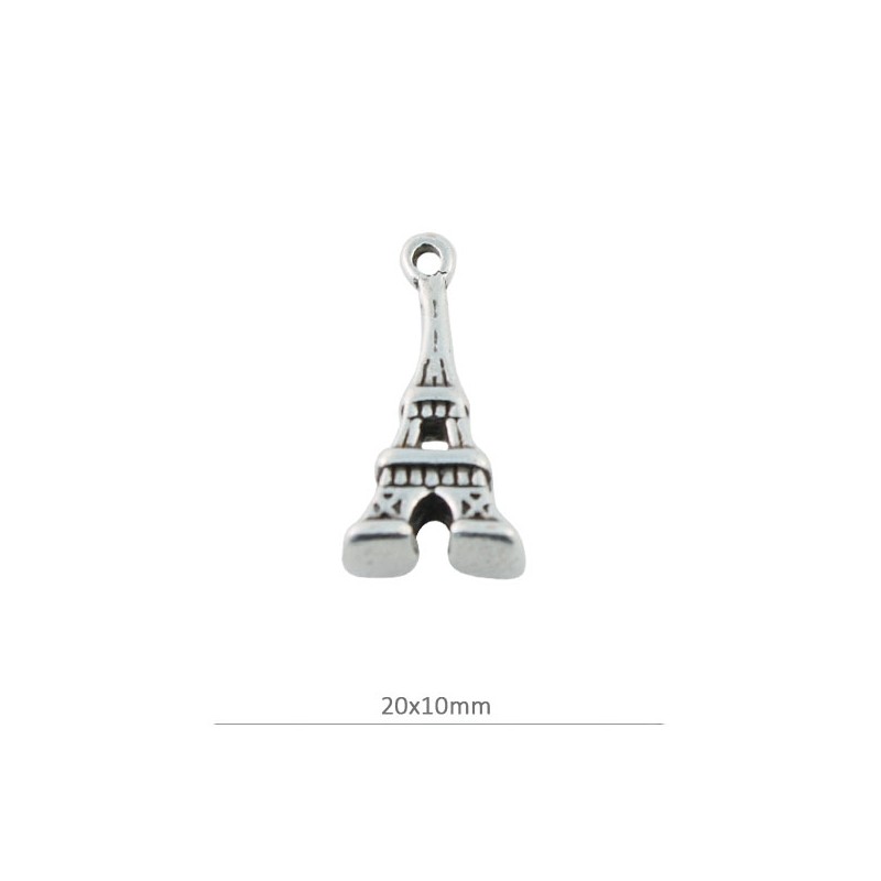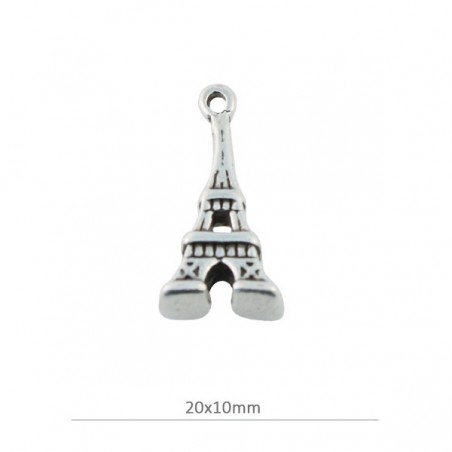 - Colgante Torre Eiffel en zamak con baño de plata. - El tamaño es de 20x10 milímetros. - El precio es por bolsa y la bolsa contiene 2 unidades.