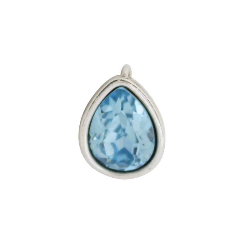 Colgante con asa en zamak con baño de plata con cristal lágrima Swarovski en color Aquamarine 14x10 mm. Le recomendamos pegar ambas piezas con nuestro pegamento especial para joyería con referencia 7405, ya que no vienen pegadas.