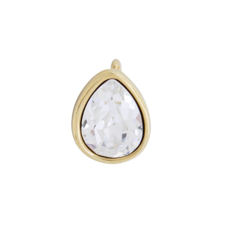 Colgante con asa en zamak con baño de oro con cristal lágrima Swarovski en color Crystal 14x10 mm. Le recomendamos pegar ambas piezas con nuestro pegamento especial para joyería con referencia 7405, ya que no vienen pegadas.