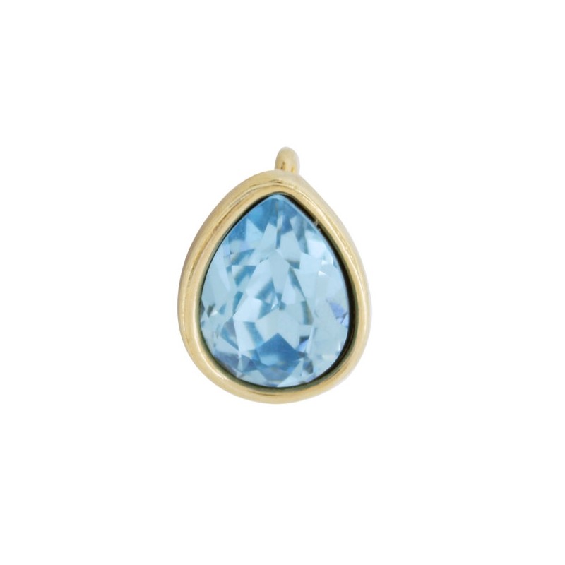 Colgante con asa en zamak con baño de oro con cristal lágrima Swarovski en color Aquamarine 14x10 mm. Le recomendamos pegar ambas piezas con nuestro pegamento especial para joyería con referencia 7405, ya que no vienen pegadas.