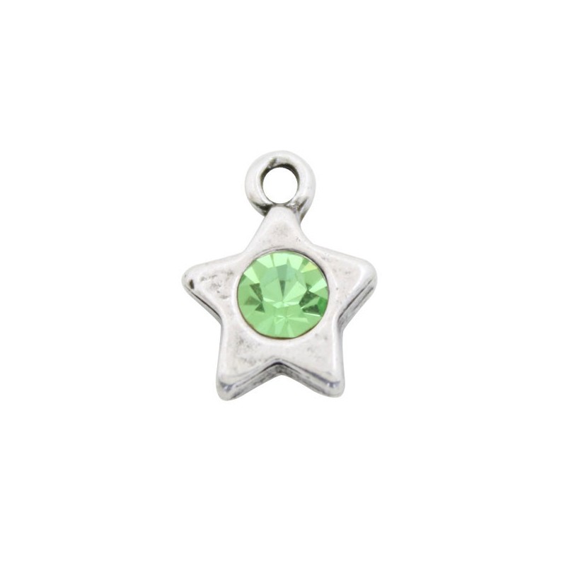 Colgante estrella con asa en zamak con baño de plata y cristal en color Peridot. Le recomendamos pegar ambas piezas con nuestro pegamento especial para joyería con referencia 7405.