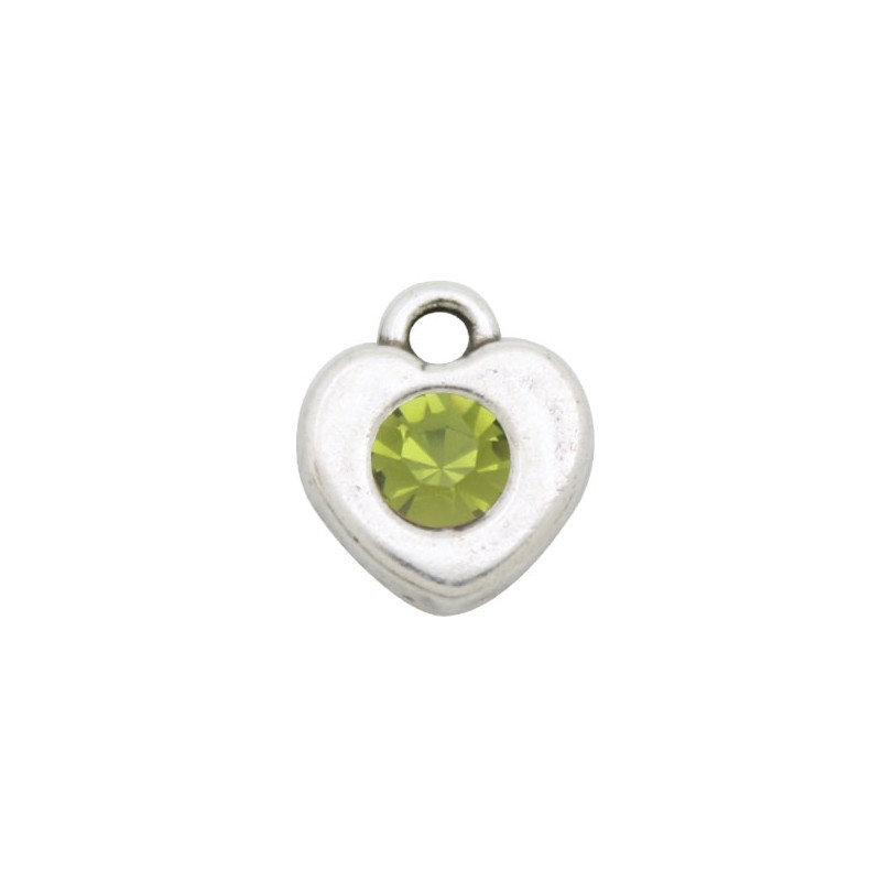 Colgante corazón con asa en zamak con baño de plata y cristal en color Olivine. Le recomendamos pegar ambas piezas con nuestro pegamento especial para joyería con referencia 7405.