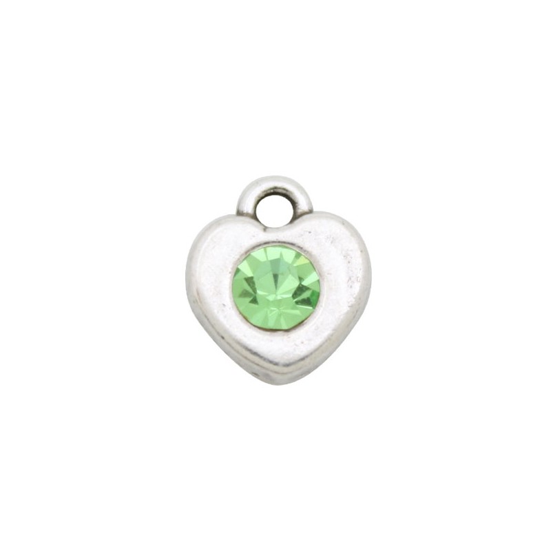 Colgante corazón con asa en zamak con baño de plata y cristal en color Peridot. Le recomendamos pegar ambas piezas con nuestro pegamento especial para joyería con referencia 7405.