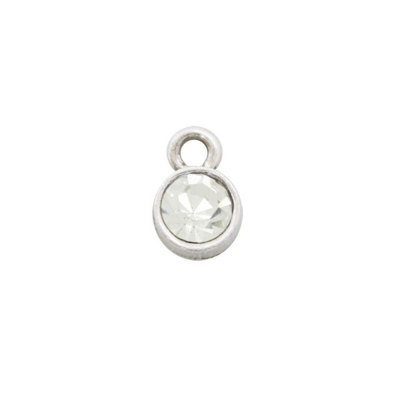 Colgante círculo con asa en zamak con baño de plata y cristal en color Crystal. Le recomendamos pegar ambas piezas con nuestro pegamento especial para joyería con referencia 7405.