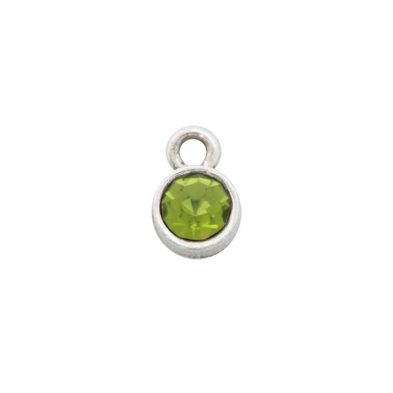 Colgante círculo con asa en zamak con baño de plata y cristal en color Olivine. Le recomendamos pegar ambas piezas con nuestro pegamento especial para joyería con referencia 7405.