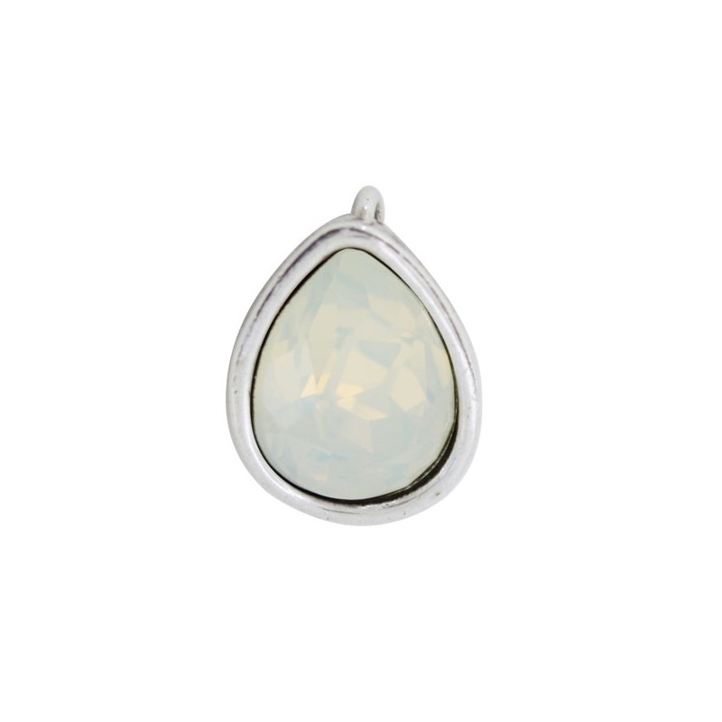 Colgante con asa en zamak con baño de plata con cristal lágrima Swarovski en color White Opal 14x10 mm. Le recomendamos pegar ambas piezas con nuestro pegamento especial para joyería con referencia 7405, ya que no vienen pegadas.
