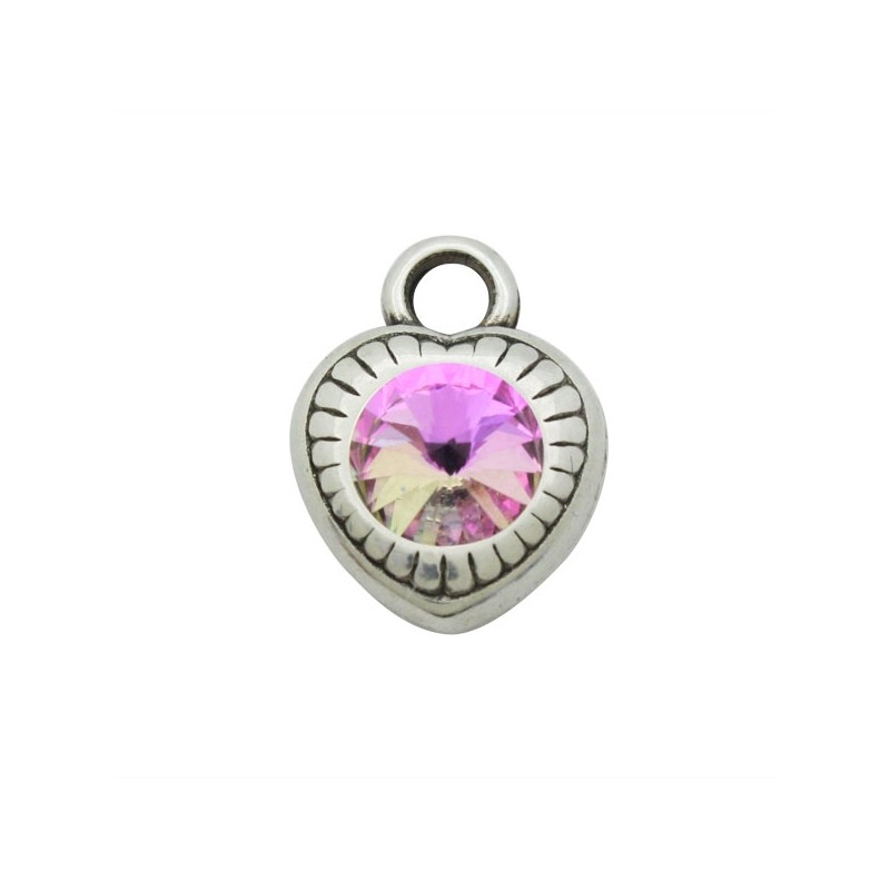 Colgante corazón con asa en zamak con baño de plata y cristal en color Crystal Vitrail Light. Le recomendamos pegar ambas piezas con nuestro pegamento especial para joyería con referencia 7405.