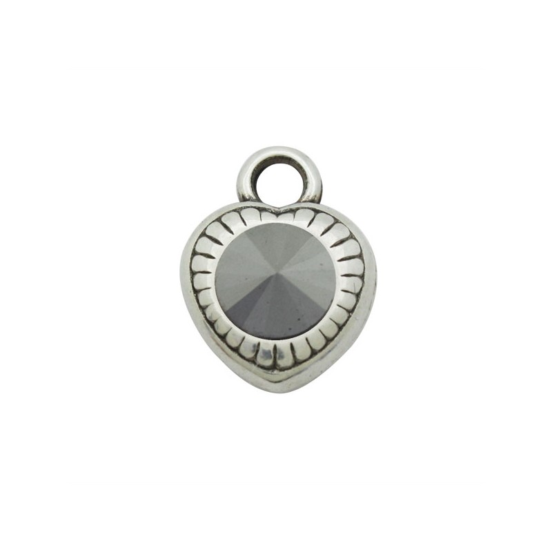 Colgante corazón con asa en zamak con baño de plata y cristal en color Jet Hematite. Le recomendamos pegar ambas piezas con nuestro pegamento especial para joyería con referencia 7405.